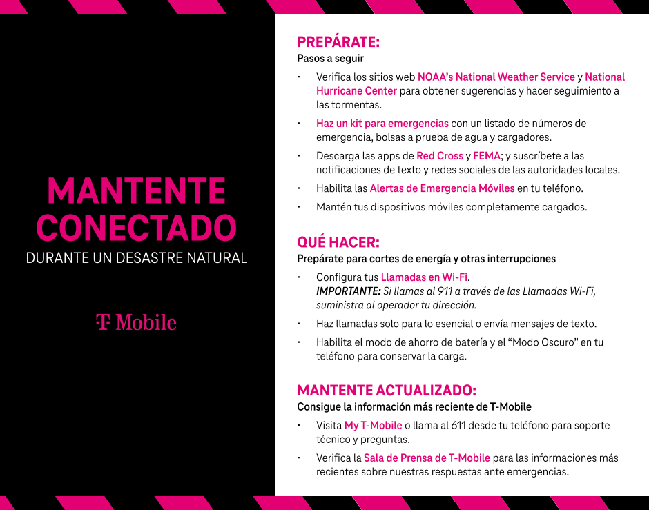 Para más información de T-Mobile sobre comunicaciones y preparación ante desastres, consulta es.t-mobile.com/news/un-carrier/t-mobile-ready-to-respond.